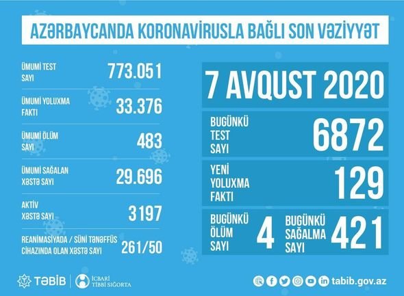 Azərbaycanda 129 yeni koronavirus infeksiyasına yoluxma faktı qeydə alınıb, 421 nəfər müalicə olunaraq sağalıb və evə buraxılıb.