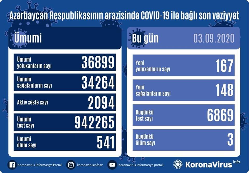 Son sutkada Azərbaycanda koronavirus (COVID-19) infeksiyasına 167 yeni yoluxma faktı qeydə alınıb, 148 nəfər müalicə olunaraq sağalıb və evə buraxılıb.